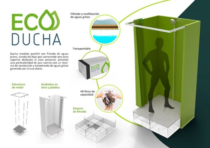 La “Ecoducha”, patentada ante Indecopi a inicios de año, funciona mediante un sistema a presión de pulverizador, no depende de conexiones o de una red de suministro, promueve el ahorro de agua optimizando los tiempos de baño y permite reciclarla gracias a su circuito de recirculación y filtración cerrado.