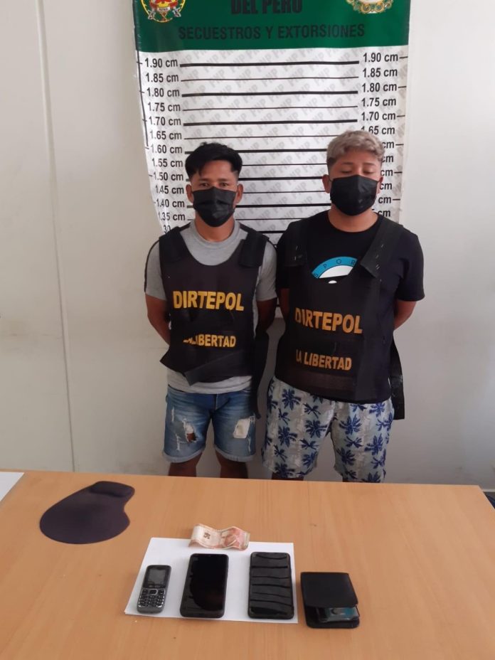 Personal policial de la Sección de Secuestros y Extorsiones intervinieron a Ronal Calderón Rubio (22) y Llon Tuanama Vela (37), quienes son acusados de exigir a dos familias dinero para no atentar contra sus vidas, en el sector Río Seco, distrito El Porvenir.