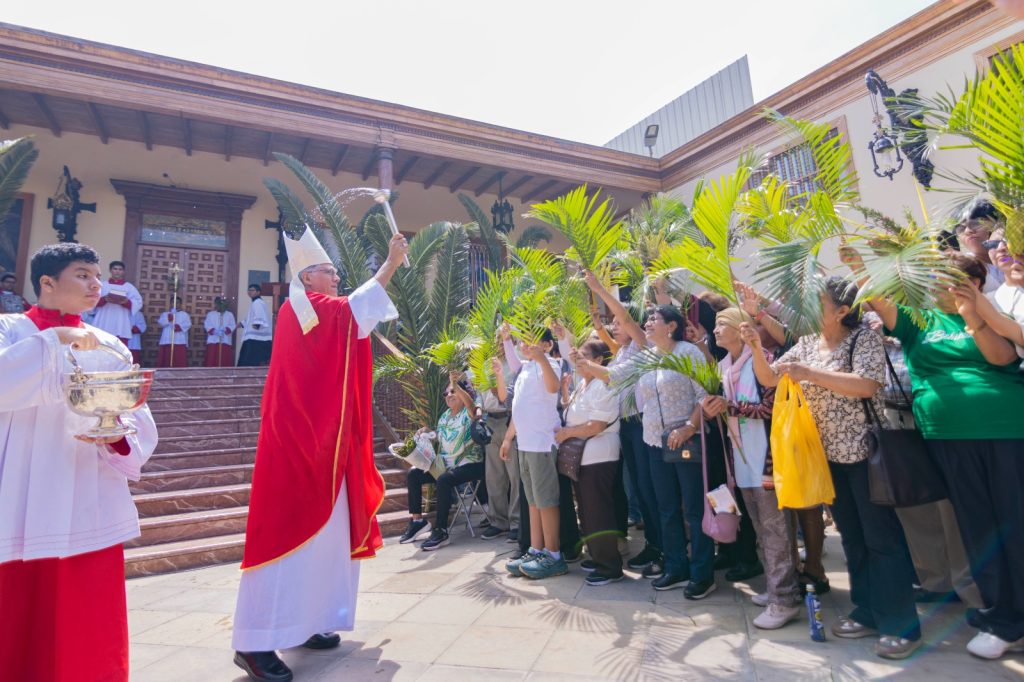 Monseñor Alfredo Vizcarra Mori, S. J., Arzobispo Metropolitano de Trujillo, bendijo las palmas y los ramos de olivo que los fieles agitaban con alegría, cantos y gratitud al Salvador en el patio del arzobispado.