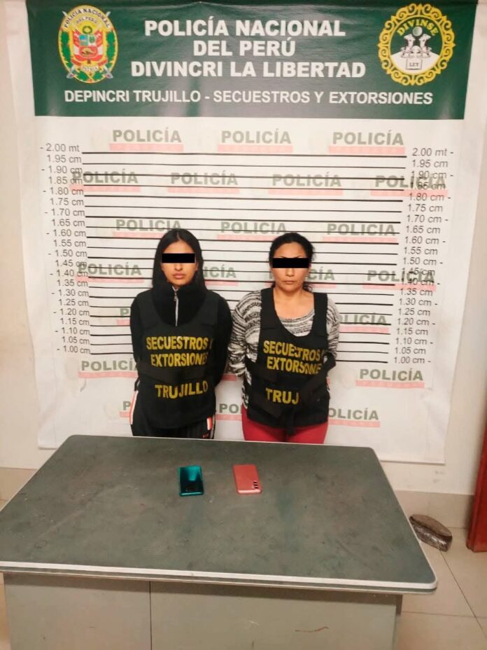Agentes del Área de Secuestro y Extorsiones de la División de Investigación Criminal (Divincri) -Trujillo capturaron a dos féminas implicadas en el presunto delito de extorsión en agravio de un ciudadano a quien le exigían el pago de 20 000 soles, a cambio de no atentar contra su vida y la de su familia. Se les incautó dos equipos celulares.