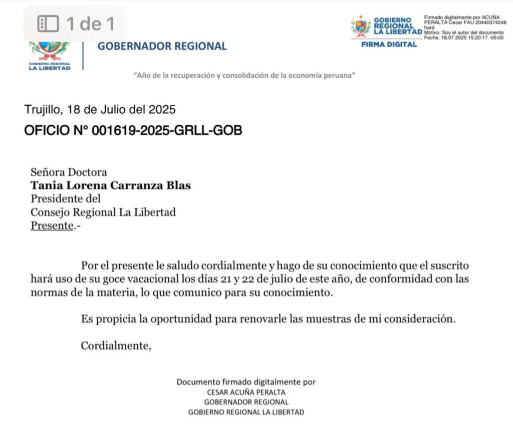 El consejero regional por la provincia de Trujillo, Robert de la Cruz, reveló que el 18 de julio César Acuña comunicó al Consejo Regional que hará uso de sus vacaciones los días 21 y 22 de este mes.