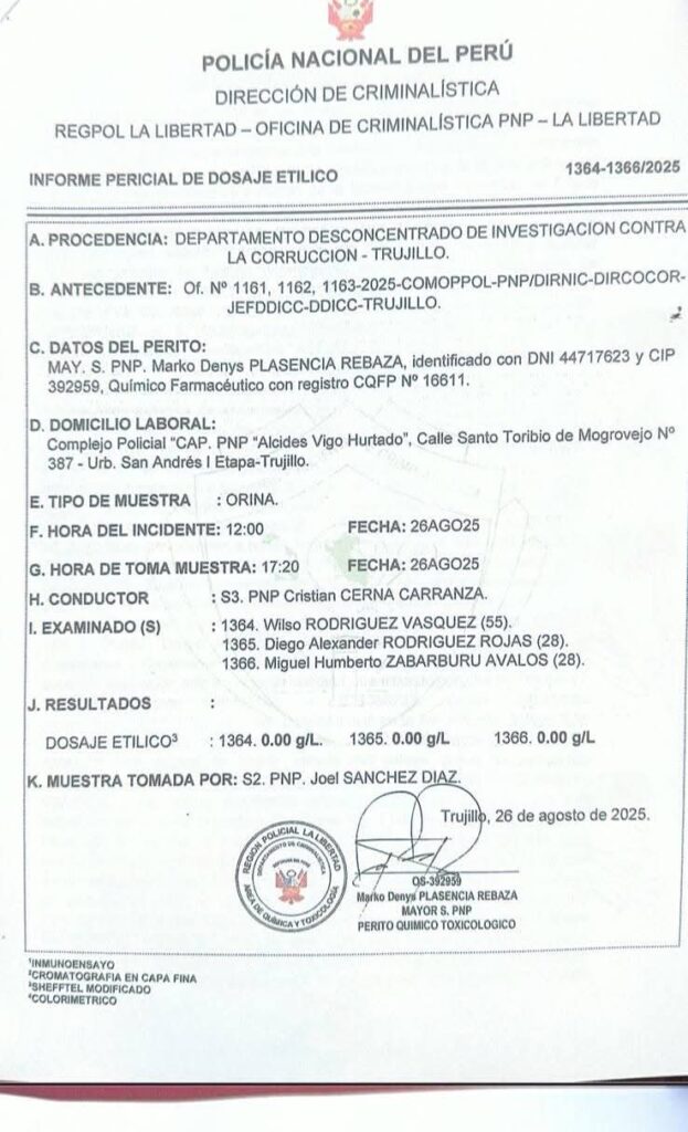Según el reporte pericial, las cantidades de alcohol por cada litro de sangre marca 0.00 g/L, lo que significa que los implicados en la intervención (del martes 26 al medio día) por parte de personal del Departamento Desconcentrado de Investigación Contra la Corrupción Trujillo quedan exentos de dicha grave acusación por el delito contra la administración pública, en la modalidad de peculado de uso.