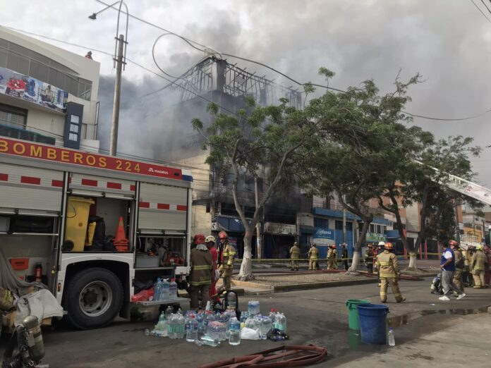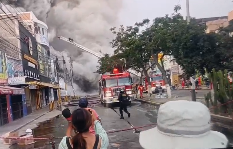 Son las 3.04 de la tarde. El incendio continúa en una tienda de venta de accesorios y repuestos ubicada en la cuadra 9 de la avenida César Vallejo, en la urbanización Palermo, en Trujillo. Se desconoce si hay personas atrapadas en el edificio.