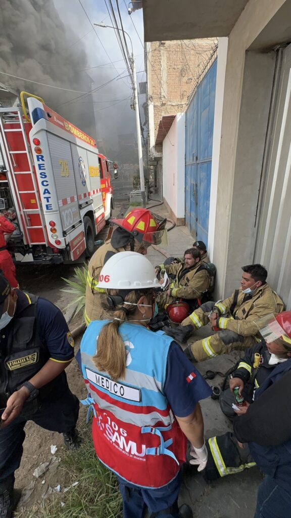 Varios de los hombres de rojo sufrieron cuadros de asfixia y algunas quemaduras como consecuencia del incendio de grandes proporciones registrado en un almacén de repuestos y lubricantes ubicado en la cuadra 9 de la avenida César Vallejo. El edificio se desplomó. Vecinos de la zona reportaron falta de agua para evitar el avance de las llamas.