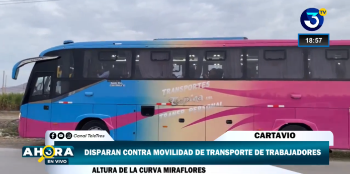 Sujetos desconocidos dispararon contra un ómnibus que transportaba personal de la empresa agroindustrial Cartavio con destino a la ciudad de Trujillo. El ataque se produjo aproximadamente a las 6:00 p.m. en la zona conocida como la curva Miraflores, en Cartavio (Ascope). El bus de placa de rodaje T8D-105 de la empresa de transportes Espina EIRL recibió dos impactos de bala. La Policía investiga este atentado que ha generado temor en los trabajadores de esta azucarera. Foto captura video Tele Tres.