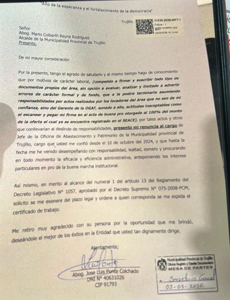 El abogado José Luis Ponce Colchado renunció al cargo de jefe de la Oficina de Abastecimiento y Patrimonio de la Municipalidad Provincial de Trujillo (MPT) y denunció el uso irregular de su firma en un proceso de licitación y otras situaciones que podrían en el futuro complicar su situación legal.