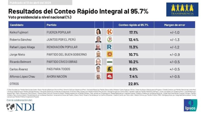 Los resultados del conteo al 100 % de Ipsos y Transparencia difundidos por Perú 21 y Latina ubican a la candidata presidencial de Fuerza Popular, Keiko Fujimori, en el primer y en el balotaje con 17;1 %. Mientras que el segundo puesto lo disputan: Roberto Sánchez de Juntos Por el Perú con 12.4 %, Rafael López Aliaga de Renovación Popular con 11,3 % y Jorge Nieto Montesinos del Partido del Buen Gobierno con 10,7 %.