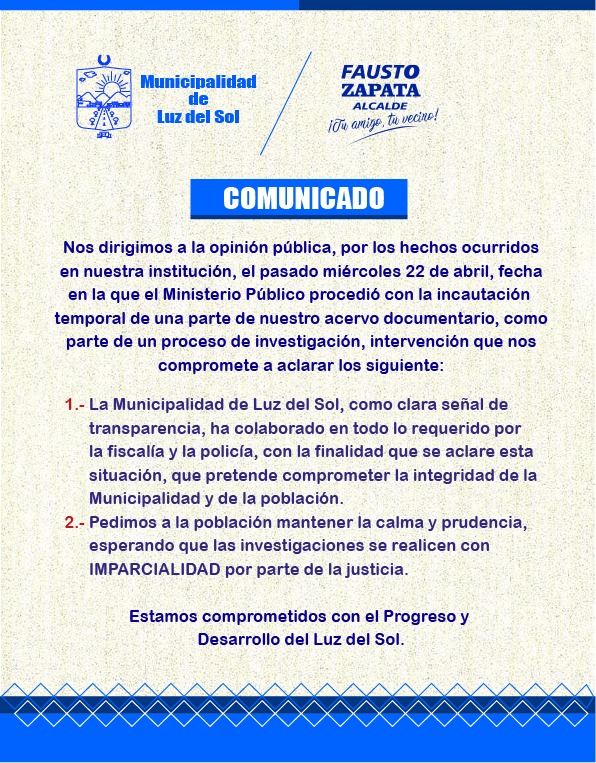 La Municipalidad de Luz del Sol emitió un comunicado en el cual informó que ha colaborado con la Fiscalía y la Policía. Además, pidió calma a la población.